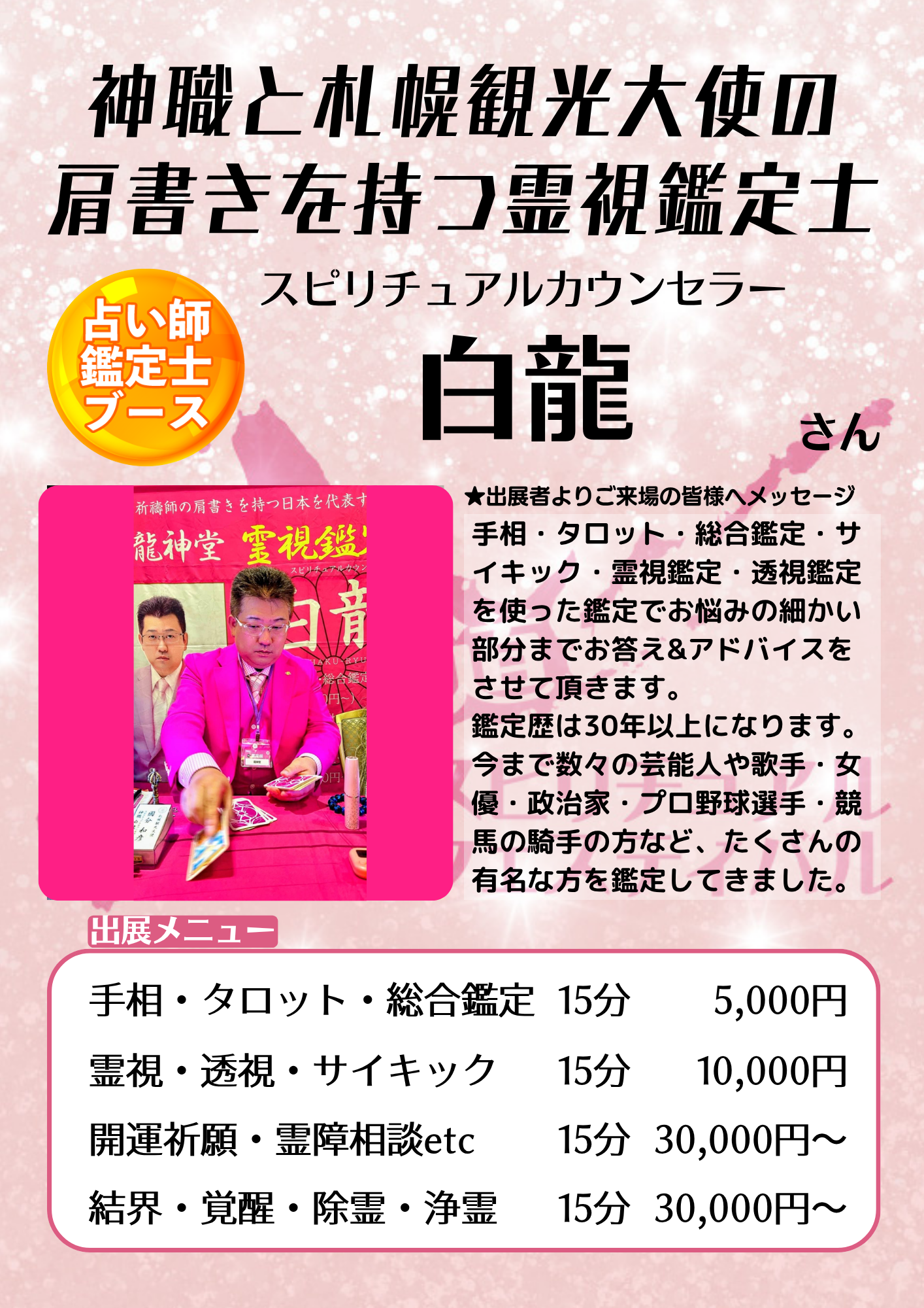 「北海道スピリチュアルフェスティバル」とは、日本全国で活躍されている占い師、ヒーラー、霊能者、超能力者、ハンドメイド作家、マッサージ師、整体師、飲食系ほか癒し系のプロフェッショナル達が1年に一度札幌に集結する一大イベントです。